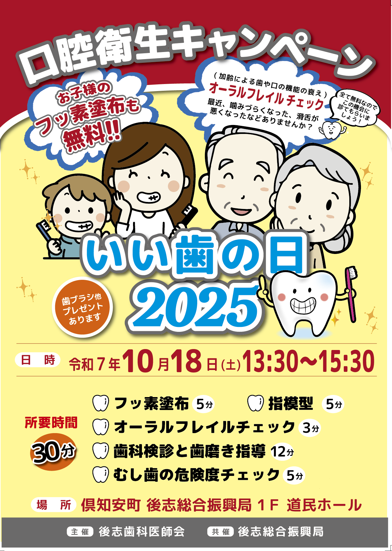 毎年、年二回の口腔衛生キャンペーン、6月の「むし歯予防デー」と10月の「いい歯の日キャンペーン」を、倶知安町の後志総合振興局道民ホールにおいて開催しております。無料歯科検診の他、歯科相談、お口の細菌チェック、歯磨き指導や最近耳にする「オーラルフレイル」では高齢者の歯や口の予防デー機能が衰えた状態の検査もできます。是非ともご参加頂き、お口の中を健康に保つためにお役立て頂きたいと思います。